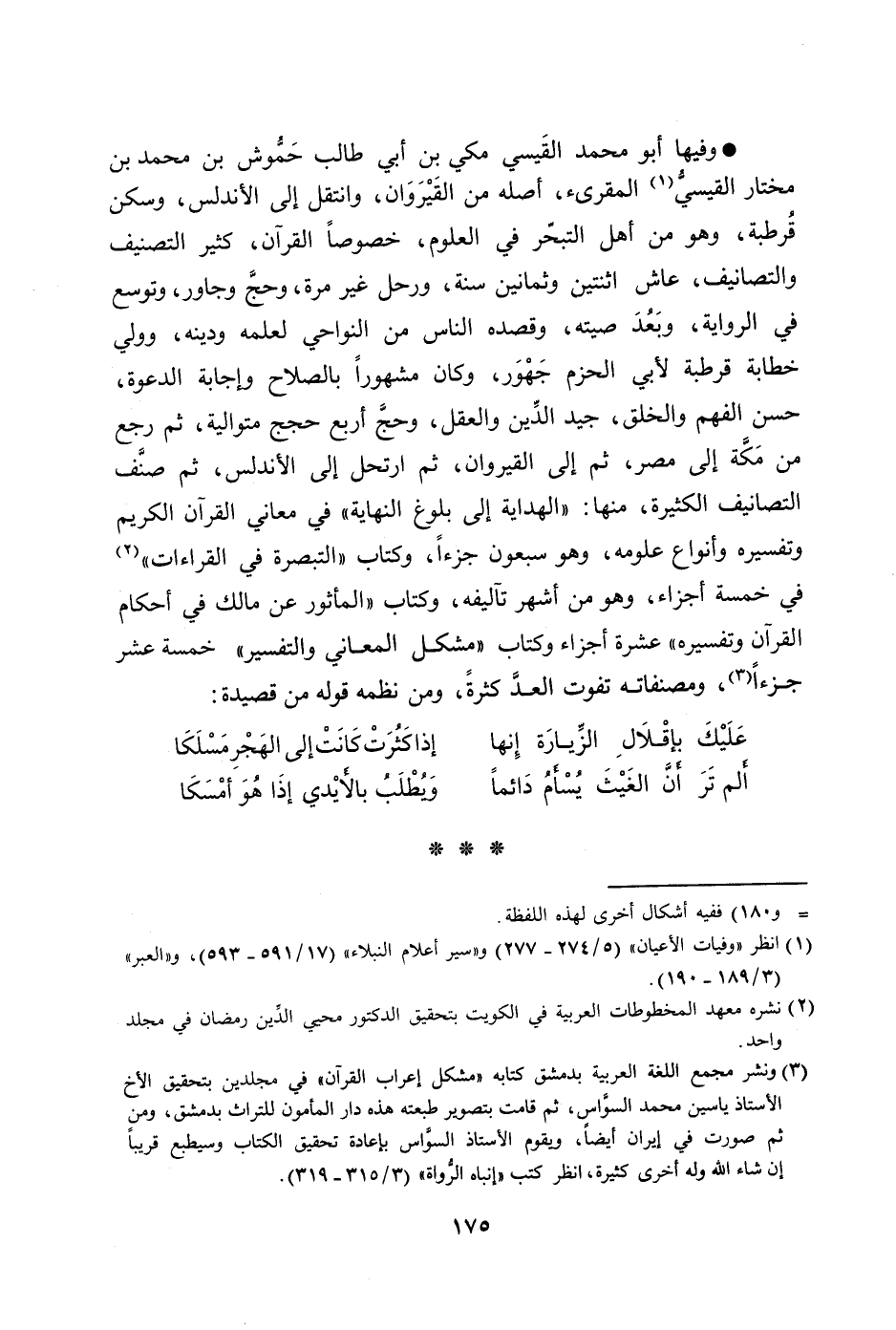 وفيها أبو محمد القيسي مكي بن أبي طالب حمّوش بن محمد بن مختار القيسيّ [1] المقرئ، أصله من القيروان، وانتقل إلى الأندلس، وسكن قرطبة، وهو من أهل التبحّر في العلوم، خصوصا القرآن، كثير التصنيف والتصانيف، عاش اثنتين وثمانين سنة، ورحل غير مرة، وحجّ وجاور، وتوسع في الرواية، وبعد صيته، وقصده الناس من النواحي لعلمه ودينه، وولي خطابة قرطبة لأبي الحزم جهور، وكان مشهورا بالصلاح وإجابة الدعوة، حسن الفهم والخلق، جيد الدّين والعقل، وحجّ أربع حجج متوالية، ثم رجع من مكّة إلى مصر، ثم إلى القيروان، ثم ارتحل إلى الأندلس، ثم صنّف التصانيف الكثيرة، ومنها: «الهداية إلى بلوغ النهاية» في معاني القرآن الكريم وتفسيره وأنواع علومه، وهو سبعون جزءا، وكتاب «التبصرة في القراءات» [2] في خمسة أجزاء، وهو من أشهر تآليفه، وكتاب «المأثور عن مالك في أحكام القرآن وتفسيره» عشرة أجزاء وكتاب «مشكل المعاني والتفسير» خمسة عشر جزءا [3] ، ومصنفاته تفوت العدّ كثرة، ومن نظمه قوله من قصيدة: