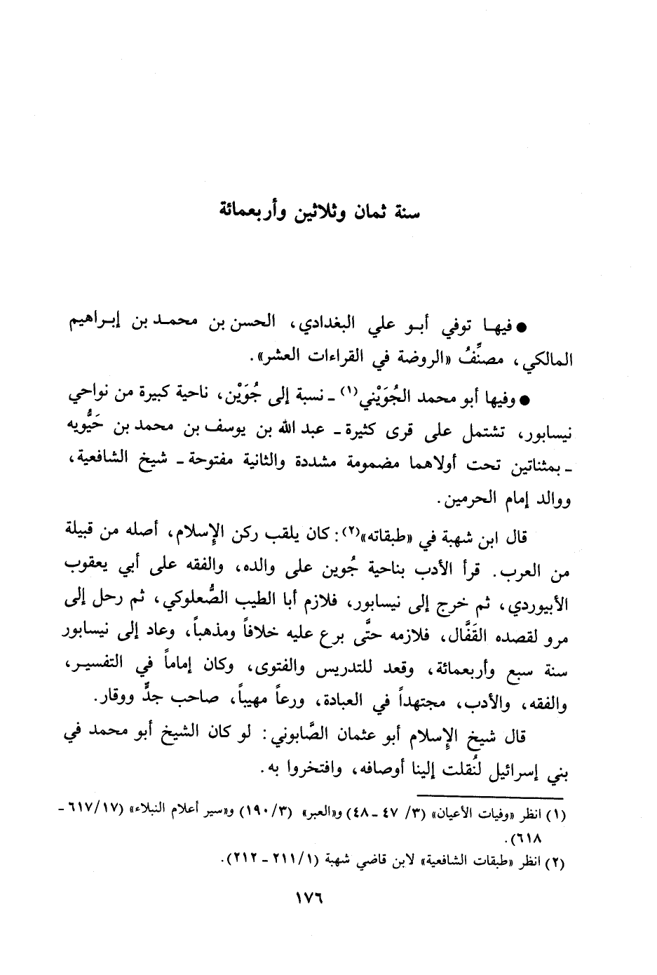 وفيها أبو محمد الجويني [1]- نسبة إلى جوين، ناحية كبيرة من نواحي نيسابور، تشتمل على قرى كثيرة- عبد الله بن يوسف بن محمد بن حيّويه- بمثناتين تحت أولاهما مضمومة مشددة والثانية مفتوحة- شيخ الشافعية، ووالد إمام الحرمين.