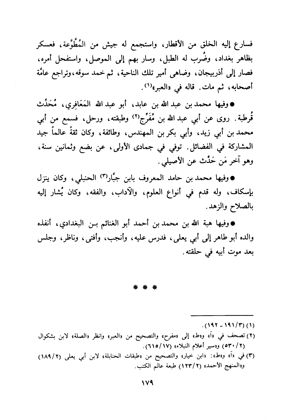 وفيها هبة الله بن محمد بن أحمد أبو الغنائم بن البغدادي، أنفذه والده أبو طاهر إلى أبي يعلى، فدرس عليه، وأنجب، وأفتى، وناظر، وجلس بعد موت أبيه في حلقته.