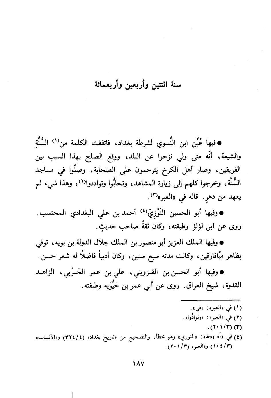 فيها عيّن ابن النّسوي لشرطة بغداد، فاتفقت الكلمة من [1] السّنّة والشيعة، أنّه متى ولي نزحوا عن البلد، ووقع الصلح بهذا السبب بين الفريقين، وصار أهل الكرخ يترحمون على الصحابة، وصلّوا في مساجد السّنّة، وخرجوا كلهم إلى زيارة المشاهد، وتحابّوا وتواددوا [2] ، وهذا شيء لم يعهد من دهر. قاله في «العبر» [3] .