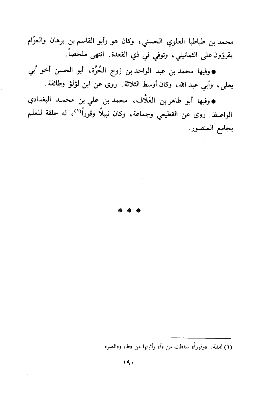 وفيها أبو طاهر بن العلّاف، محمد بن علي بن محمد البغدادي الواعظ. روى عن القطيعي وجماعة، وكان نبيلا وقورا [1] ، له حلقة للعلم بجامع المنصور.
