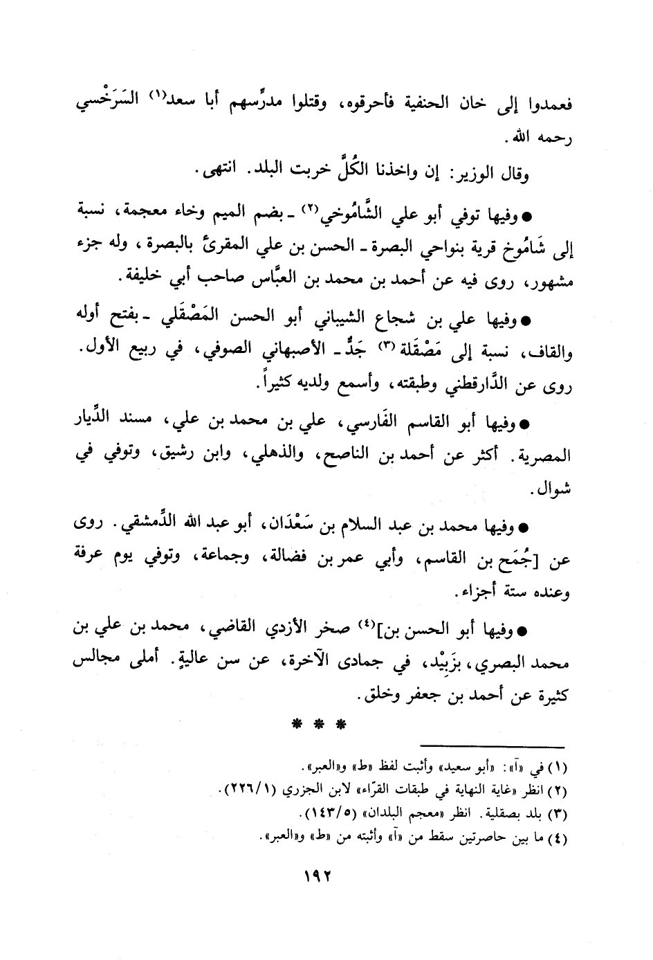 وفيها توفي أبو علي الشّاموخي [2]- بضم الميم وخاء معجمة، نسبة إلى شاموخ قرية بنواحي البصرة- الحسن بن علي المقرئ بالبصرة، وله جزء مشهور، روى فيه عن أحمد بن محمد بن العبّاس صاحب أبي خليفة.