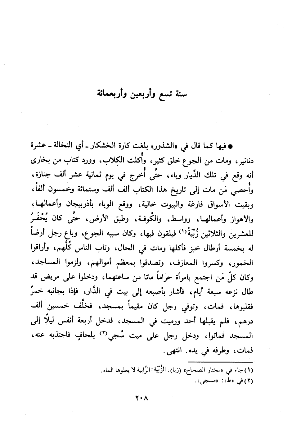 فيها كما قال في «الشذور» بلغت كارة الخشكار- أي النخالة- عشرة دنانير، ومات من الجوع خلق كثير، وأكلت الكلاب، وورد كتاب من بخارى أنه وقع في تلك الدّيار وباء، حتّى أخرج في يوم ثمانية عشر ألف جنازة، وأحصي من مات إلى تاريخ هذا الكتاب ألف ألف وستمائة وخمسون ألفا، وبقيت الأسواق فارغة والبيوت خالية، ووقع الوباء بأذربيجان وأعمالها، والأهواز وأعمالها، وواسط، والكوفة، وطبق الأرض، حتّى كان يحفر للعشرين والثلاثين زبية [1] فيلقون فيها، وكان سببه الجوع، وباع رجل أرضا له بخمسة أرطال خبز فأكلها ومات في الحال، وتاب الناس كلّهم، وأراقوا الخمور، وكسروا المعازف، وتصدقوا بمعظم أموالهم، ولزموا المساجد، وكان كلّ من اجتمع بامرأة حراما ماتا من ساعتهما، ودخلوا على مريض قد طال نزعه سبعة أيام، فأشار بإصبعه إلى بيت في الدّار، فإذا بجانبه خمر فقلبوها، فمات، وتوفي رجل كان مقيما بمسجد، فخلّف خمسين ألف درهم، فلم يقبلها أحد ورميت في المسجد، فدخل أربعة أنفس ليلا إلى المسجد فماتوا، ودخل رجل على ميت سجي [2] بلحاف فاجتذبه عنه، فمات، وطرفه في يده. انتهى.