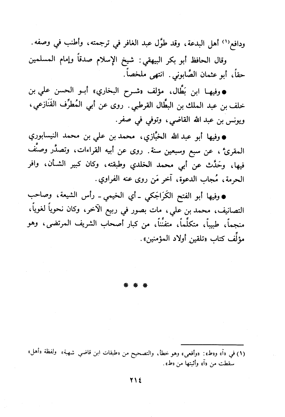 وفيها أبو الفتح الكراجكي- أي الخيمي- رأس الشيعة، وصاحب التصانيف، محمد بن علي، مات بصور في ربيع الآخر، وكان نحويا لغويا، منجما، طبيبا، متكلّما، متفنّنا، من كبار أصحاب الشريف المرتضى، وهو مؤلّف كتاب «تلقين أولاد المؤمنين» .
