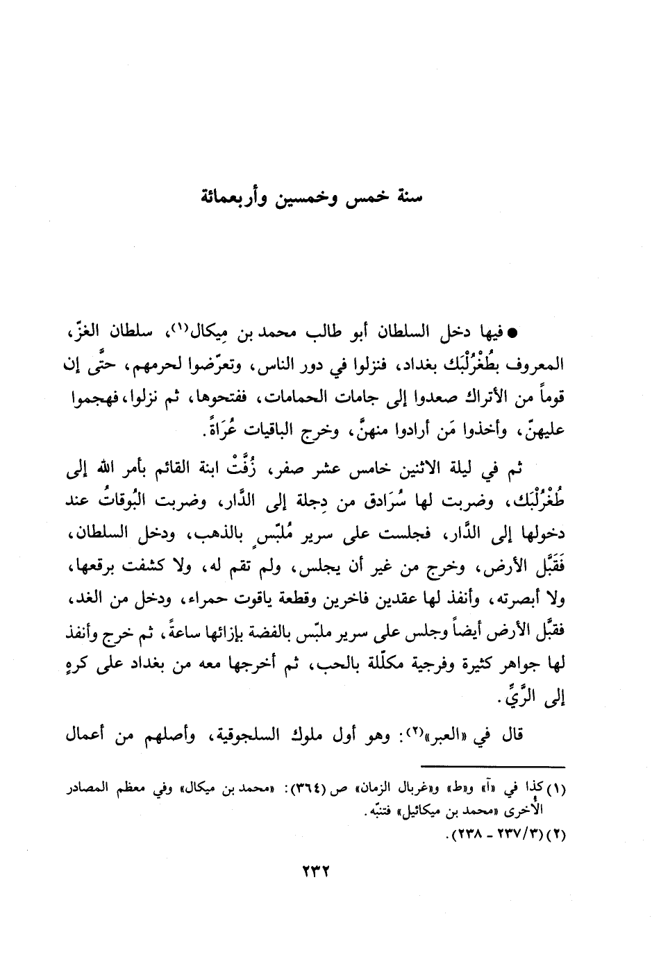 فيها دخل السلطان أبو طالب محمد بن ميكال [1] ، سلطان الغزّ، المعروف بطغرلبك بغداد، فنزلوا في دور الناس، وتعرّضوا لحرمهم، حتّى إن قوما من الأتراك صعدوا إلى جامات الحمامات، ففتحوها، ثم نزلوا، فهجموا عليهنّ، وأخذوا من أرادوا منهنّ، وخرج الباقيات عراة.