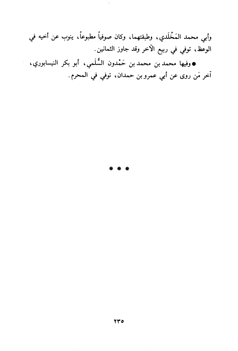 وفيها محمد بن محمد بن حمدون السّلمي، أبو بكر النيسابوري، آخر من روى عن أبي عمرو بن حمدان، توفي في المحرم.