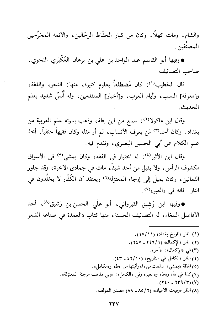 وفيها ابن رشيق القيرواني، أبو علي الحسن بن رشيق [8] ، أحد الأفاضل البلغاء، له التصانيف الحسنة، منها كتاب «العمدة في صناعة الشعر