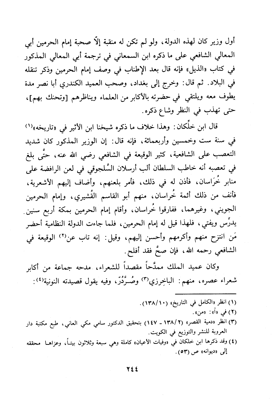 قال ابن خلّكان: وهذا خلاف ما ذكره شيخنا ابن الأثير في «تاريخه» [1] في سنة ست وخمسين وأربعمائة، فإنه قال: إن الوزير المذكور كان شديد التعصب على الشافعية، كثير الوقيعة في الشافعي رضي الله عنه، حتّى بلغ في تعصبه أنه خاطب السلطان ألب أرسلان السّلجوقي في لعن الرافضة على منابر خراسان، فأذن له في ذلك، فأمر بلعنهم، وأضاف إليهم الأشعرية، فأنت من ذلك أئمة خراسان، منهم أبو القاسم القشيري، وإمام الحرمين الجويني، وغيرهما، ففارقوا خراسان، وأقام إمام الحرمين بمكة أربع سنين.
