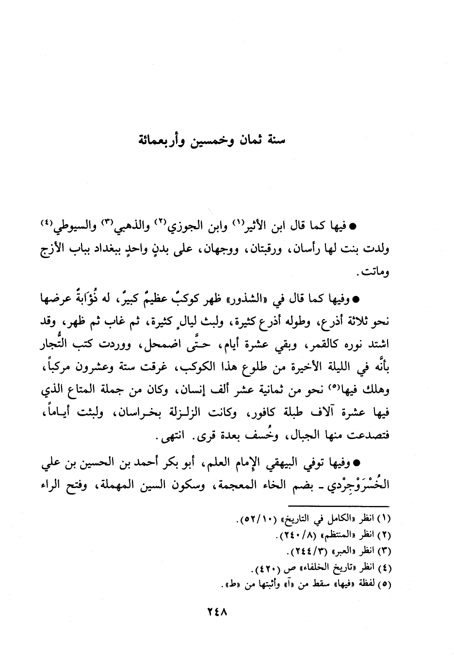 فيها كما قال ابن الأثير [1] وابن الجوزي [2] والذهبي [3] والسيوطي [4] ولدت بنت لها رأسان، ورقبتان، ووجهان، على بدن واحد ببغداد بباب الأزج وماتت.