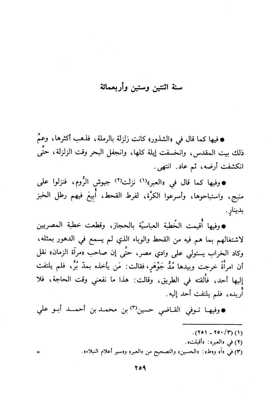 فيها كما قال في «الشذور» كانت زلزلة بالرملة، فذهب أكثرها، وعمّ ذلك بيت المقدس، وانخسفت إيلة كلها، وانجفل البحر وقت الزلزلة، حتّى انكشفت أرضه، ثم عاد. انتهى.