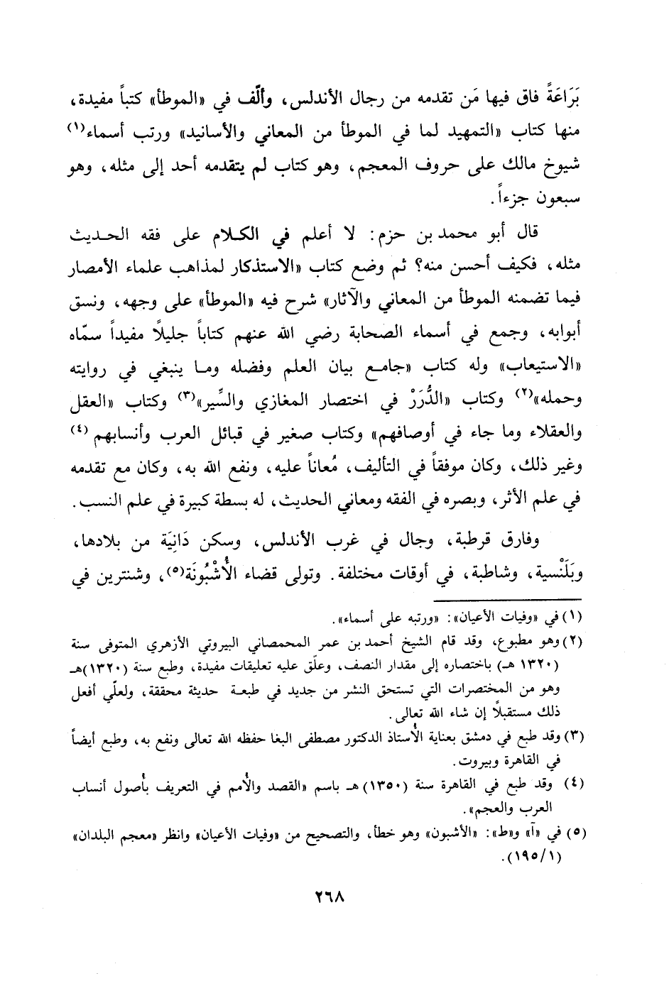 براعة فاق فيها من تقدمه من رجال الأندلس، وألّف في «الموطأ» كتبا مفيدة، منها كتاب «التمهيد لما في الموطأ من المعاني والأسانيد» ورتب أسماء [1] شيوخ مالك على حروف المعجم، وهو كتاب لم يتقدمه أحد إلى مثله، وهو سبعون جزءا.