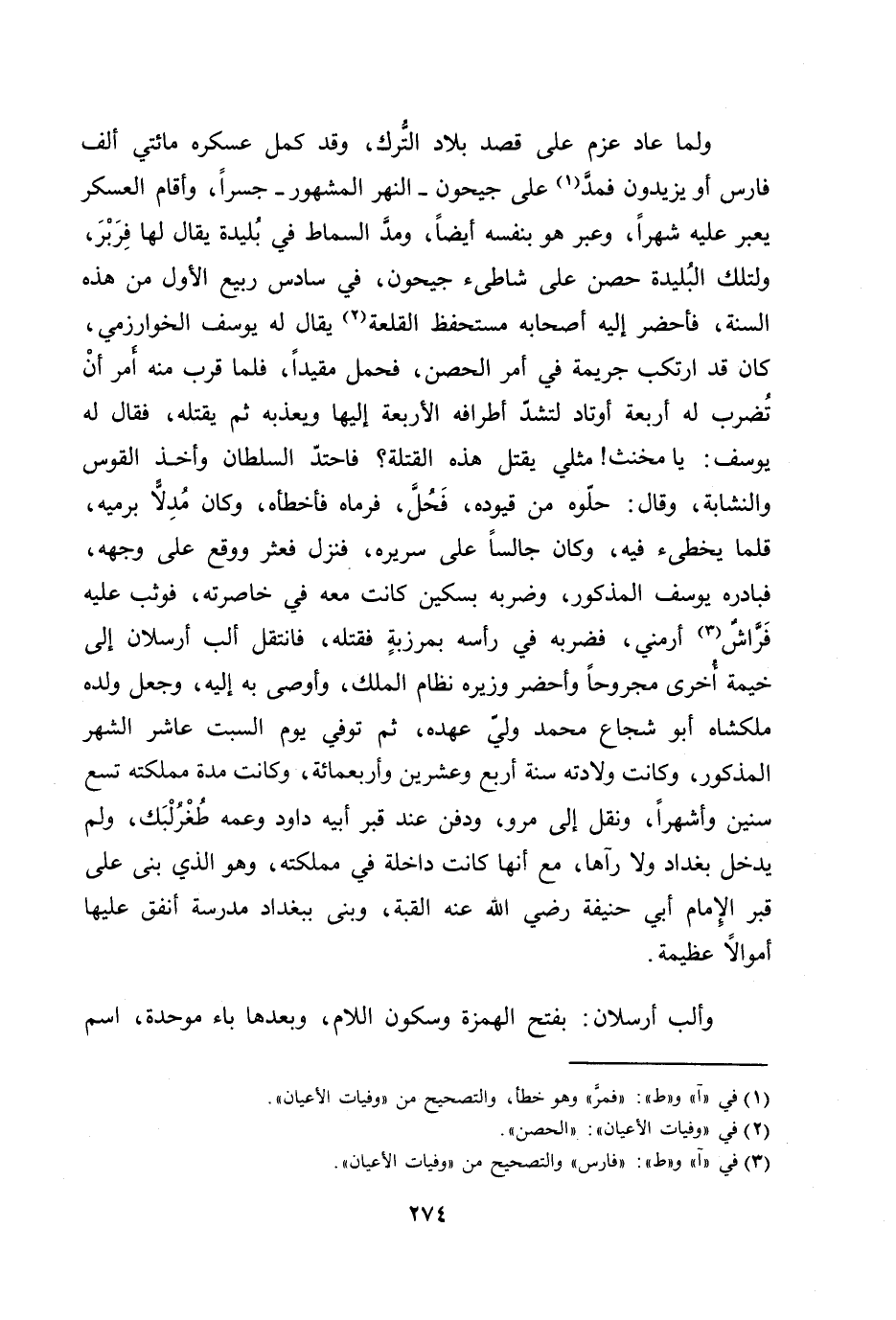 ولما عاد عزم على قصد بلاد التّرك، وقد كمل عسكره مائتي ألف فارس أو يزيدون فمدّ [1] على جيحون- النهر المشهور- جسرا، وأقام العسكر يعبر عليه شهرا، وعبر هو بنفسه أيضا، ومدّ السماط في بليدة يقال لها فربر، ولتلك البليدة حصن على شاطئ جيحون، في سادس ربيع الأول من هذه السنة، فأحضر إليه أصحابه مستحفظ القلعة [2] يقال له يوسف الخوارزمي، كان قد ارتكب جريمة في أمر الحصن، فحمل مقيدا، فلما قرب منه أمر أن تضرب له أربعة أوتاد لتشدّ أطرافه الأربعة إليها ويعذبه ثم يقتله، فقال له يوسف: يا مخنث! مثلي يقتل هذه القتلة؟ فاحتدّ السلطان وأخذ القوس والنشابة، وقال: حلّوه من قيوده، فحلّ، فرماه فأخطأه، وكان مدلّا برميه، قلما يخطئ فيه، وكان جالسا على سريره، فنزل فعثر ووقع على وجهه، فبادره يوسف المذكور، وضربه بسكين كانت معه في خاصرته، فوثب عليه فرّاش [3] أرمني، فضربه في رأسه بمرزبة فقتله، فانتقل ألب أرسلان إلى خيمة أخرى مجروحا وأحضر وزيره نظام الملك، وأوصى به إليه، وجعل ولده ملكشاه أبو شجاع محمد وليّ عهده، ثم توفي يوم السبت عاشر الشهر المذكور، وكانت ولادته سنة أربع وعشرين وأربعمائة، وكانت مدة مملكته تسع سنين وأشهرا، ونقل إلى مرو، ودفن عند قبر أبيه داود وعمه طغرلبك، ولم يدخل بغداد ولا رآها، مع أنها كانت داخلة في مملكته، وهو الذي بنى على قبر الإمام أبي حنيفة رضي الله عنه القبة، وبنى ببغداد مدرسة أنفق عليها أموالا عظيمة.