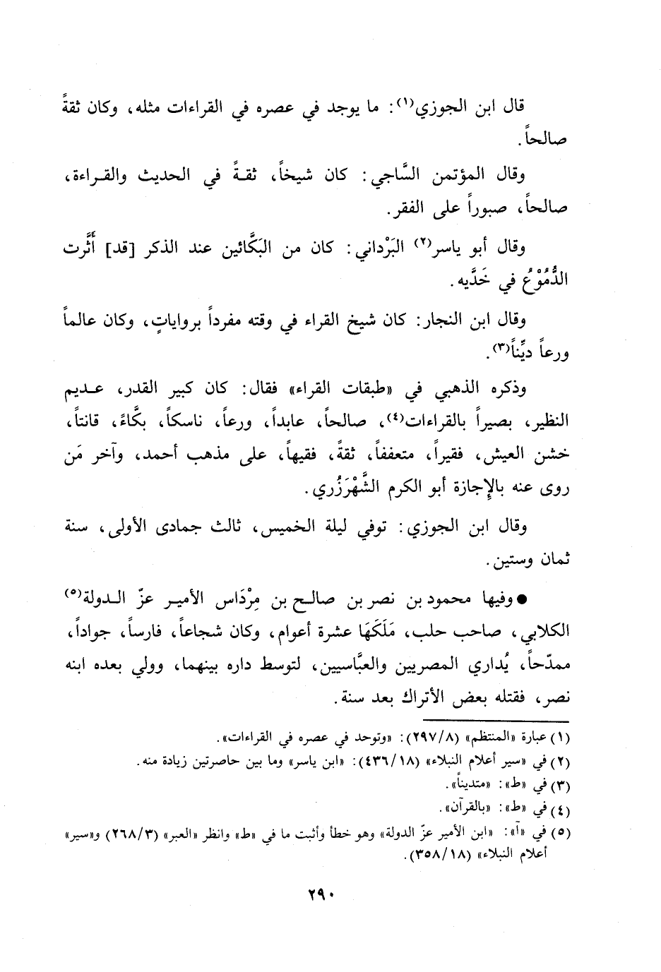 [1] عبارة «المنتظم» (8/ 297) : «وتوحد في عصره في القراءات» .