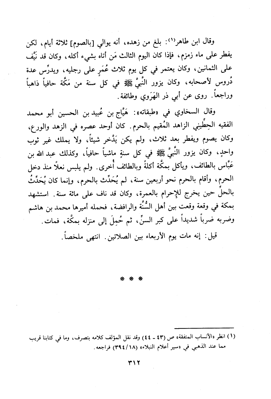 وقال السخاوي في «طبقاته» : هيّاج بن عبيد بن الحسين أبو محمد الفقيه الحطّيني الزاهد المقيم بالحرم. كان أوحد عصره في الزهد والورع، وكان يصوم ويفطر بعد ثلاث، ولم يكن يدّخر شيئا، ولا يملك غير ثوب واحد، وكان يزور النّبيّ صلى الله عليه وسلم في كل سنة ماشيا حافيا، وكذلك عبد الله بن عبّاس بالطائف، ويأكل بمكّة أكلة وبالطائف أخرى. ولم يلبس نعلا منذ دخل الحرم، وأقام بالحرم نحو أربعين سنة، لم يحدّث بالحرم، وإنما كان يحدّث بالحلّ حين يخرج للإحرام بالعمرة، وكان قد ناف على مائة سنة. استشهد بمكة في وقعة وقعت بين أهل السّنّة والرافضة، فحمله أميرها محمد بن هاشم وضربه ضربا شديدا على كبر السنّ، ثم حمل إلى منزله بمكّة، فمات.