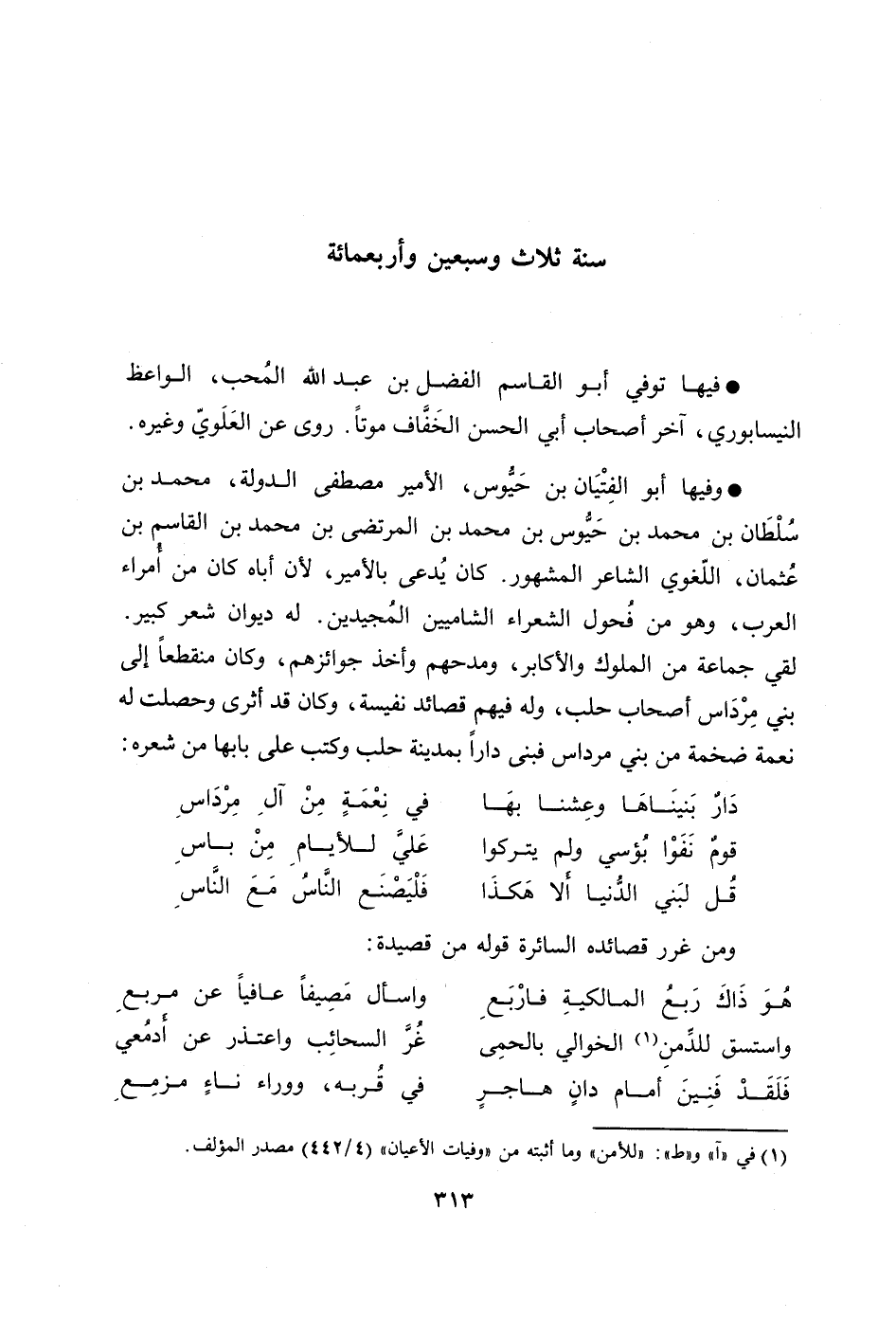 وفيها أبو الفتيان بن حيّوس، الأمير مصطفى الدولة، محمد بن سلطان بن محمد بن حيّوس بن محمد بن المرتضى بن محمد بن القاسم بن عثمان، اللّغوي الشاعر المشهور. كان يدعى بالأمير، لأن أباه كان من أمراء العرب، وهو من فحول الشعراء الشاميين المجيدين. له ديوان شعر كبير.