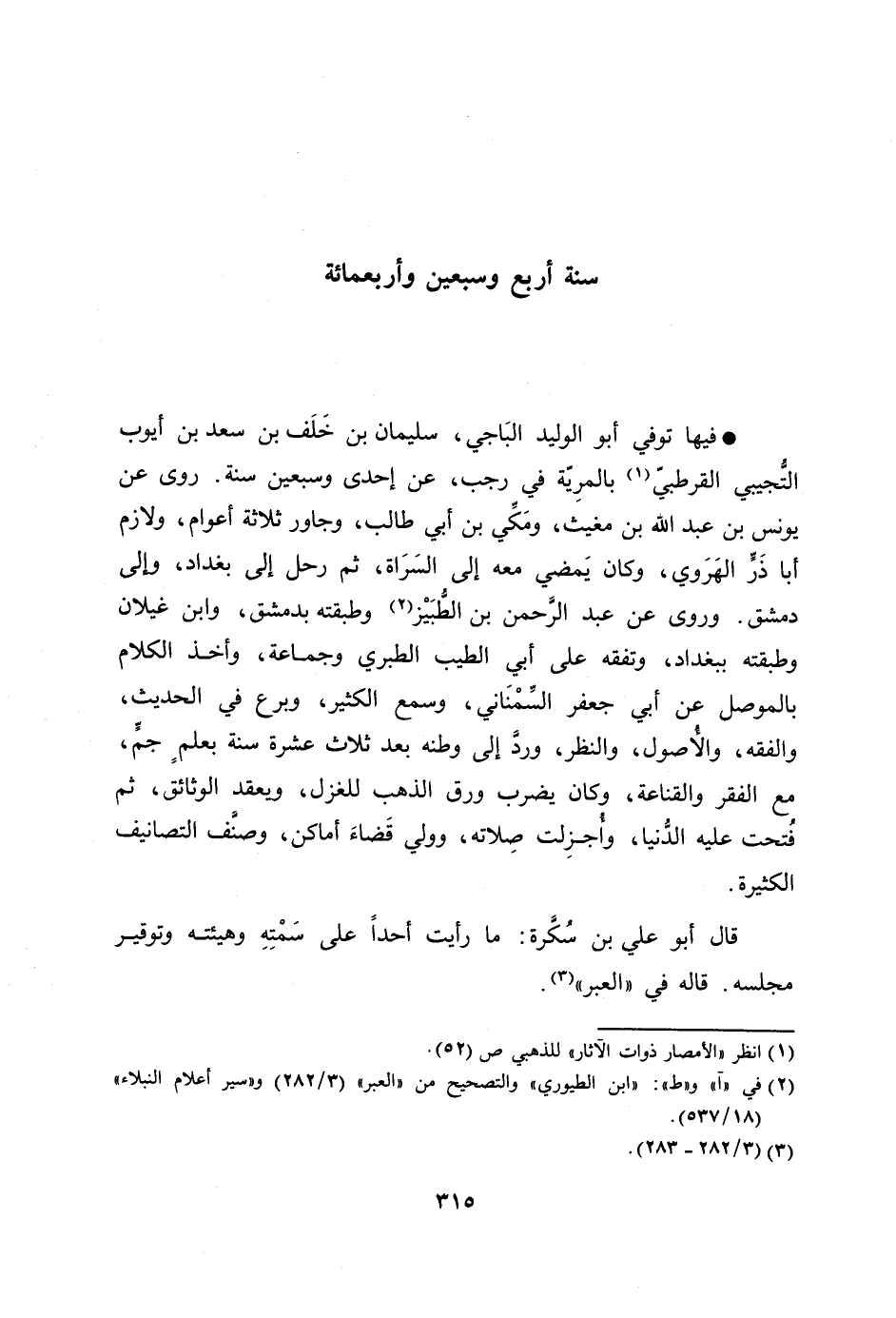 فيها توفي أبو الوليد الباجي، سليمان بن خلف بن سعد بن أيوب التّجيبي القرطبيّ [1] بالمريّة في رجب، عن إحدى وسبعين سنة. روى عن يونس بن عبد الله بن مغيث، ومكّي بن أبي طالب، وجاور ثلاثة أعوام، ولازم أبا ذرّ الهروي، وكان يمضي معه إلى السراة، ثم رحل إلى بغداد، وإلى دمشق. وروى عن عبد الرّحمن بن الطّبيز [2] وطبقته بدمشق، وابن غيلان وطبقته ببغداد، وتفقه على أبي الطيب الطبري وجماعة، وأخذ الكلام بالموصل عن أبي جعفر السّمناني، وسمع الكثير، وبرع في الحديث، والفقه، والأصول، والنظر، وردّ إلى وطنه بعد ثلاث عشرة سنة بعلم جمّ، مع الفقر والقناعة، وكان يضرب ورق الذهب للغزل، ويعقد الوثائق، ثم فتحت عليه الدّنيا، وأجزلت صلاته، وولي قضاء أماكن، وصنّف التصانيف الكثيرة.