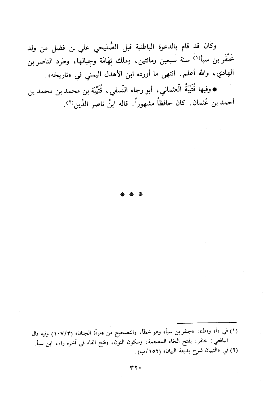 وكان قد قام بالدعوة الباطنية قبل الصّليحي علي بن فضل من ولد خنفر بن سبأ [1] سنة سبعين ومائتين، وملك تهامة وجبالها، وطرد الناصر بن الهادي، والله أعلم. انتهى ما أورده ابن الأهدل اليمني في «تاريخه» .