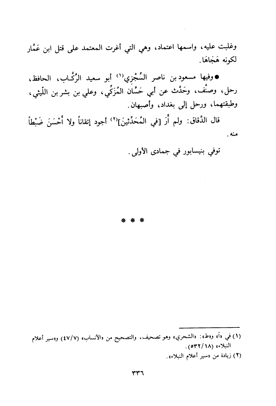 وفيها مسعود بن ناصر السّجزي [1] أبو سعيد الرّكّاب، الحافظ، رحل، وصنّف، وحدّث عن أبي حسّان المزكّي، وعلي بن بشر بن اللّيثي، وطبقتهما، ورحل إلى بغداد، وإصبهان.