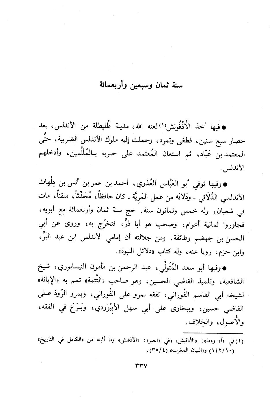 فيها أخذ الأذفونش [1] لعنه الله، مدينة طليطلة من الأندلس، بعد حصار سبع سنين، فطغى وتمرد، وحملت إليه ملوك الأندلس الضريبة، حتّى المعتمد بن عبّاد، ثم استعان المعتمد على حربه بالملثّمين، وأدخلهم الأندلس.