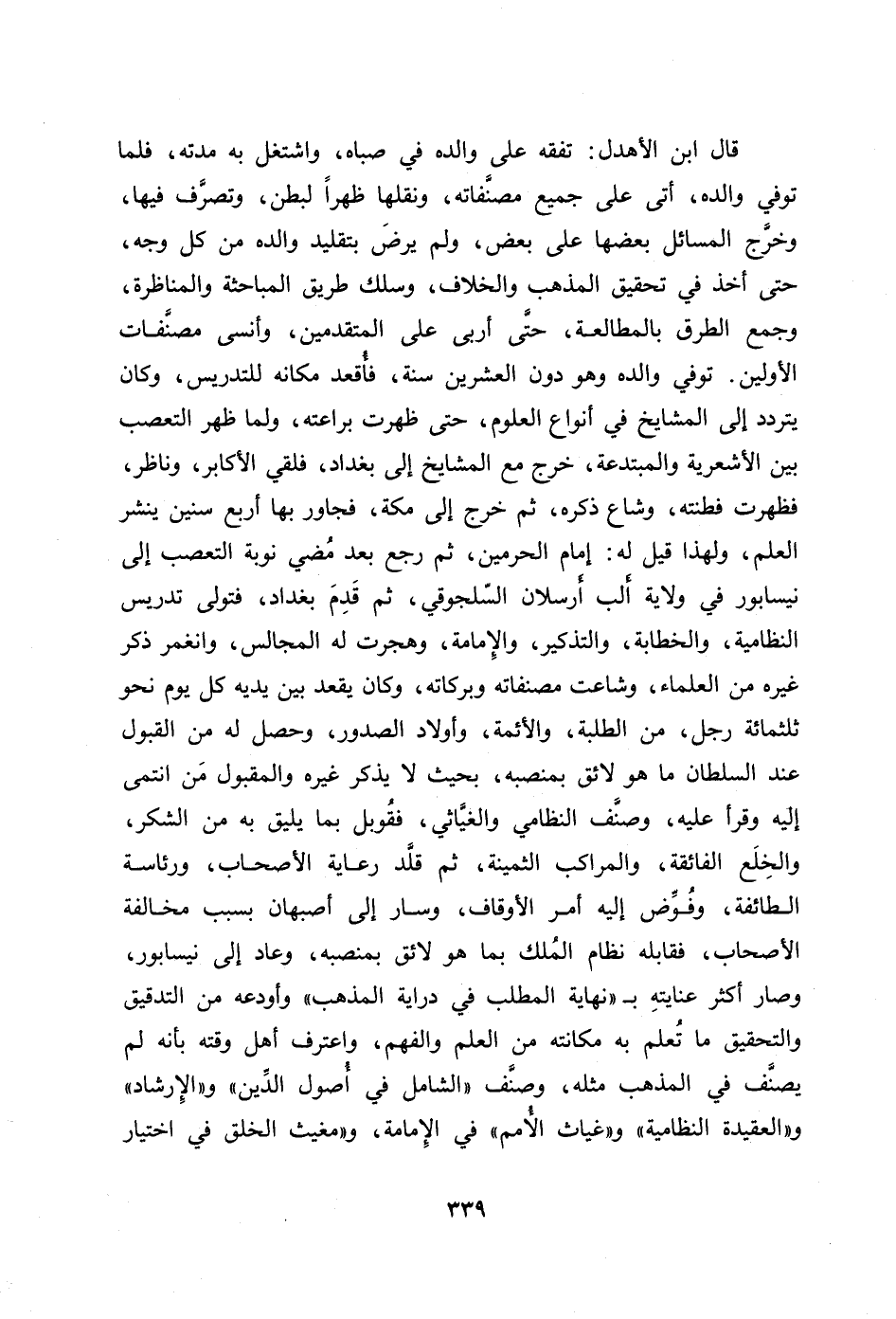 قال ابن الأهدل: تفقه على والده في صباه، واشتغل به مدته، فلما توفي والده، أتى على جميع مصنّفاته، ونقلها ظهرا لبطن، وتصرّف فيها، وخرّج المسائل بعضها على بعض، ولم يرض بتقليد والده من كل وجه، حتى أخذ في تحقيق المذهب والخلاف، وسلك طريق المباحثة والمناظرة، وجمع الطرق بالمطالعة، حتّى أربى على المتقدمين، وأنسى مصنّفات الأولين. توفي والده وهو دون العشرين سنة، فأقعد مكانه للتدريس، وكان يتردد إلى المشايخ في أنواع العلوم، حتى ظهرت براعته، ولما ظهر التعصب بين الأشعرية والمبتدعة، خرج مع المشايخ إلى بغداد، فلقي الأكابر، وناظر، فظهرت فطنته، وشاع ذكره، ثم خرج إلى مكة، فجاور بها أربع سنين ينشر العلم، ولهذا قيل له: إمام الحرمين، ثم رجع بعد مضي نوبة التعصب إلى نيسابور في ولاية ألب أرسلان السّلجوقي، ثم قدم بغداد، فتولى تدريس النظامية، والخطابة، والتذكير، والإمامة، وهجرت له المجالس، وانغمر ذكر غيره من العلماء، وشاعت مصنفاته وبركاته، وكان يقعد بين يديه كل يوم نحو ثلاثمائة رجل، من الطلبة، والأئمة، وأولاد الصدور، وحصل له من القبول عند السلطان ما هو لائق بمنصبه، بحيث لا يذكر غيره والمقبول من انتمى إليه وقرأ عليه، وصنّف النظامي والغيّاثي، فقوبل بما يليق به من الشكر، والخلع الفائقة، والمراكب الثمينة، ثم قلّد رعاية الأصحاب، ورئاسة الطائفة، وفوّض إليه أمر الأوقاف، وسار إلى أصبهان بسبب مخالفة الأصحاب، فقابله نظام الملك بما هو لائق بمنصبه، وعاد إلى نيسابور، وصار أكثر عنايته ب- «نهاية المطلب في دراية المذهب» وأودعه من التدقيق والتحقيق ما تعلم به مكانته من العلم والفهم، واعترف أهل وقته بأنه لم يصنّف في المذهب مثله، وصنّف «الشامل في أصول الدّين» و «الإرشاد» و «العقيدة النظامية» و «غياث الأمم» في الإمامة، و «مغيث الخلق في اختيار