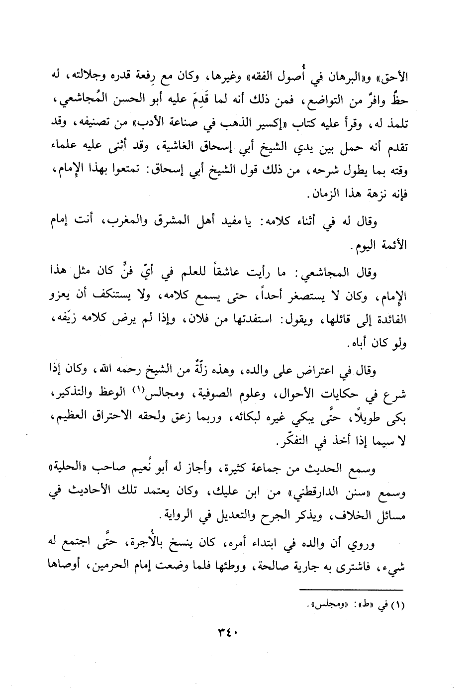 الأحق» و «البرهان في أصول الفقه» وغيرها، وكان مع رفعة قدره وجلالته، له حظ وافر من التواضع، فمن ذلك أنه لما قدم عليه أبو الحسن المجاشعي، تلمذ له، وقرأ عليه كتاب «إكسير الذهب في صناعة الأدب» من تصنيفه، وقد تقدم أنه حمل بين يدي الشيخ أبي إسحاق الغاشية، وقد أثنى عليه علماء وقته بما يطول شرحه، من ذلك قول الشيخ أبي إسحاق: تمتعوا بهذا الإمام، فإنه نزهة هذا الزمان.