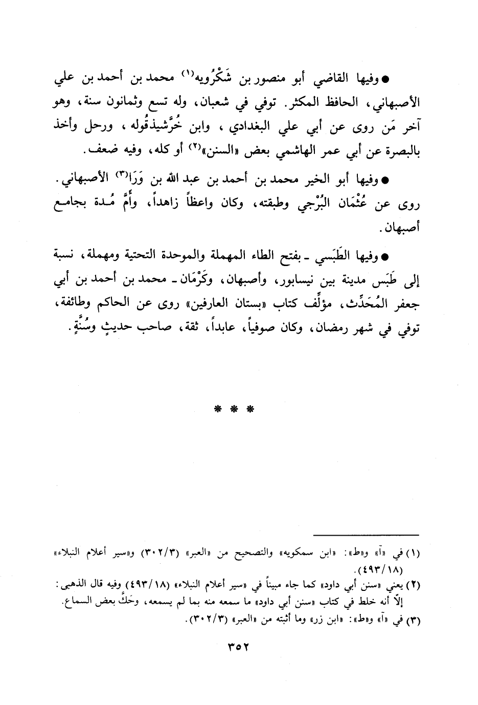 وفيها الطبسي- بفتح الطاء المهملة والموحدة التحتية ومهملة، نسبة إلى طبس مدينة بين نيسابور، وأصبهان، وكرمان- محمد بن أحمد بن أبي جعفر المحدّث، مؤلّف كتاب «بستان العارفين» روى عن الحاكم وطائفة، توفي في شهر رمضان، وكان صوفيا، عابدا، ثقة، صاحب حديث وسنّة.