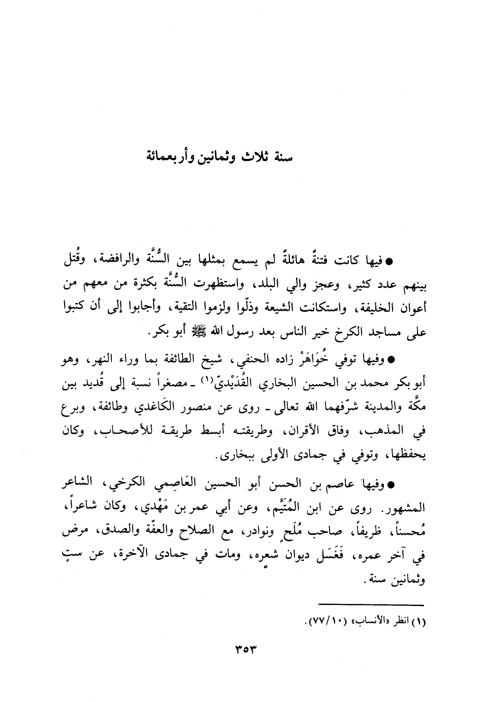 فيها كانت فتنة هائلة لم يسمع بمثلها بين السّنّة والرافضة، وقتل بينهم عدد كثير، وعجز والي البلد، واستظهرت السّنّة بكثرة من معهم من أعوان الخليفة، واستكانت الشيعة وذلّوا ولزموا التقية، وأجابوا إلى أن كتبوا على مساجد الكرخ خير الناس بعد رسول الله صلّى الله عليه وسلّم أبو بكر.