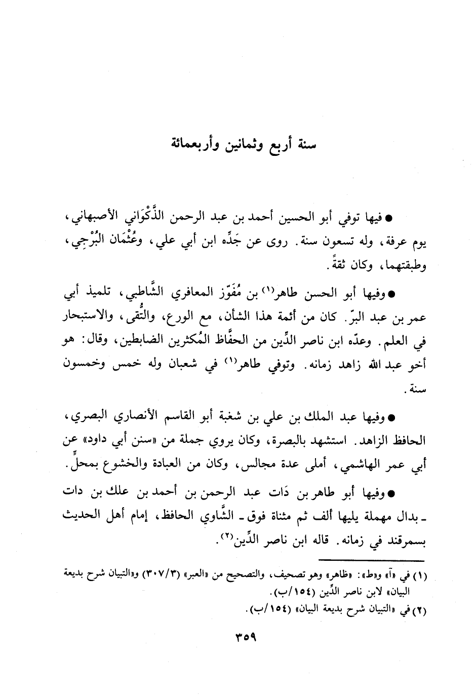 فيها توفي أبو الحسين أحمد بن عبد الرحمن الذّكواني الأصبهاني، يوم عرفة، وله تسعون سنة. روى عن جدّه ابن أبي علي، وعثمان البرجي، وطبقتهما، وكان ثقة.