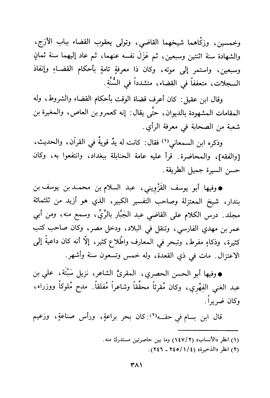 وفيها أبو يوسف القزويني، عبد السلام بن محمد بن يوسف بن بندار، شيخ المعتزلة وصاحب التفسير الكبير، الذي هو أزيد من ثلاثمائة مجلد. درس الكلام على القاضي عبد الجبّار بالرّيّ، وسمع منه، ومن أبي عمر بن مهدي الفارسي، وتنقل في البلاد، ودخل مصر، وكان صاحب كتب كثيرة، وذكاء مفرط، وتبحر في المعارف واطّلاع كثير، إلّا أنه كان داعية إلى الاعتزال. مات في ذي القعدة، وله خمس وتسعون سنة وأشهر.