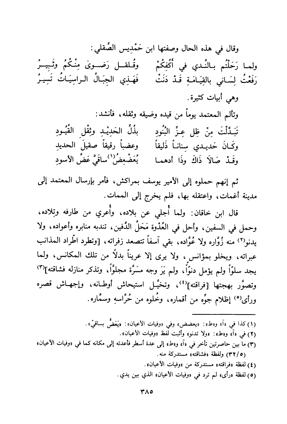 قال ابن خاقان: ولما أجلي عن بلاده، وأعري من طارفه وتلاده، وحمل في السفين، وأحل في العدوة محلّ الدّفين، تندبه منابره وأعواده، ولا يدنو [2] منه زوّاره ولا عوّاده، بقي آسفا تتصعد زفراته، [وتطرد اطّراد المذانب عبراته، ويخلو بمؤانس، ولا يرى إلا عرينا بدلا من تلك المكانس، ولما يجد سلوّا ولم يؤمل دنوّا، ولم ير وجه مسرّة مجلوّا، وتذكر منازله فشاقته] [3] وتصوّر بهجتها [فراقته] [4] ، وتخيّل استيحاش أوطانه، وإجهاش قصره ورأى [5] إظلام جوّه من أقماره، وخلوه من حرّاسه وسمّاره.