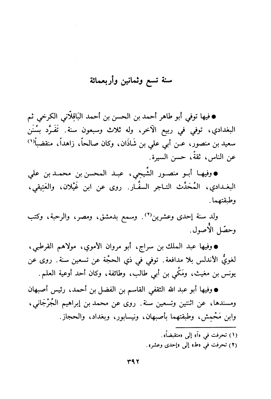 فيها توفي أبو طاهر أحمد بن الحسن بن أحمد الباقلّاني الكرخي ثم البغدادي، توفي في ربيع الآخر، وله ثلاث وسبعون سنة. تفرّد بسنن سعيد بن منصور، عن أبي علي بن شاذان، وكان صالحا، زاهدا، منقضبا [1] عن الناس، ثقة، حسن السيرة.