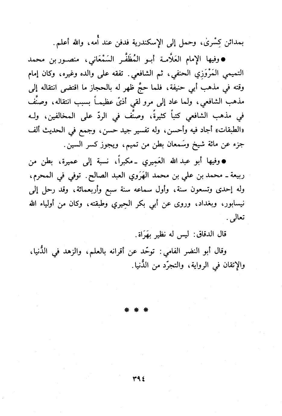 وفيها الإمام العلّامة أبو المظفّر السمعاني، منصور بن محمد التميمي المروزي الحنفي، ثم الشافعي. تفقه على والده وغيره، وكان إمام وقته في مذهب أبي حنيفة، فلما حجّ ظهر له بالحجاز ما اقتضى انتقاله إلى مذهب الشافعي، ولما عاد إلى مرو لقي أذى عظيما بسبب انتقاله، وصنّف في مذهب الشافعي كتبا كثيرة، وصنّف في الرّد على المخالفين، وله «الطبقات» أجاد فيه وأحسن، وله تفسير جيد حسن، وجمع في الحديث ألف جزء عن مائة شيخ وسمعان بطن من تميم، ويجوز كسر السين.