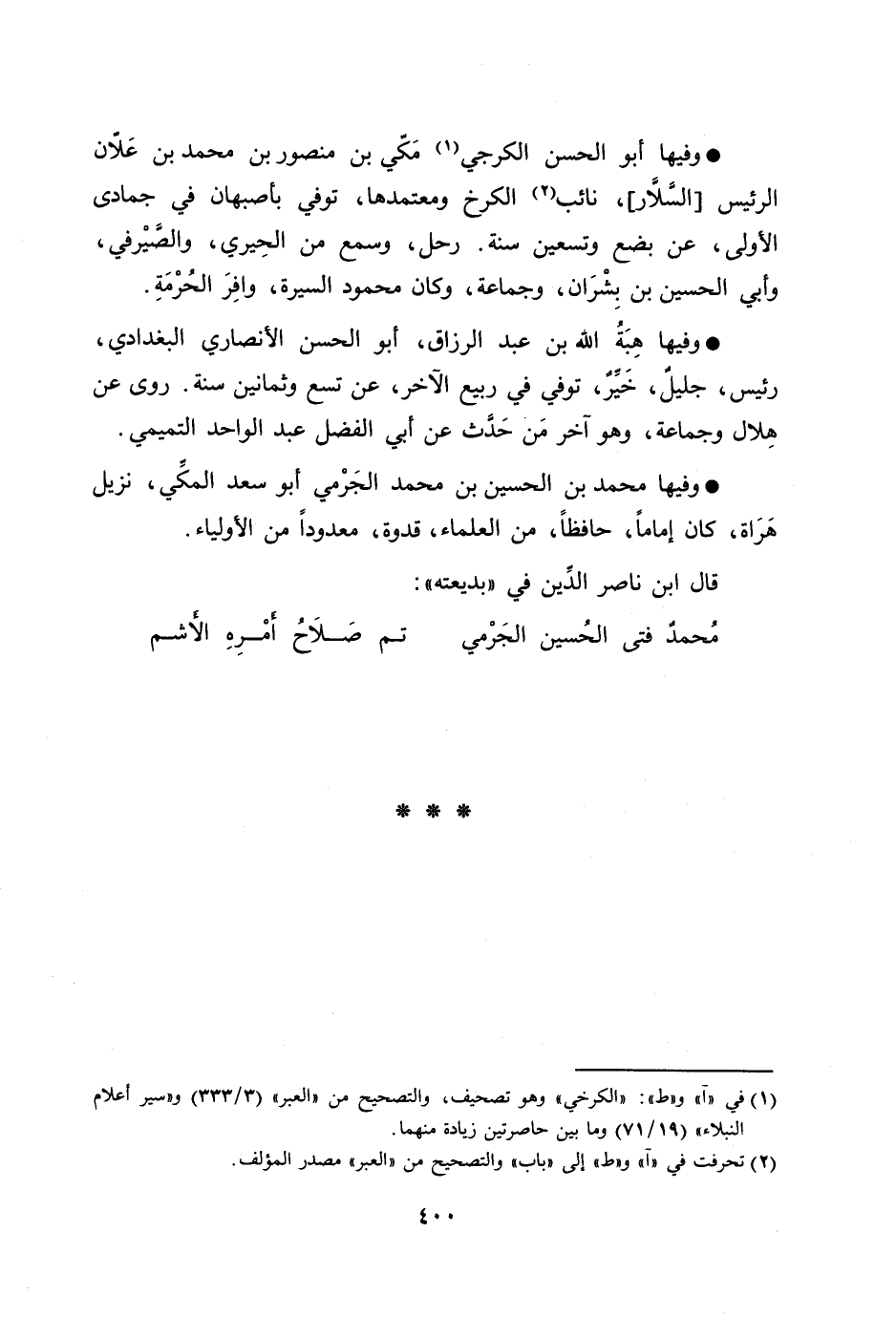 وفيها أبو الحسن الكرجي [1] مكّي بن منصور بن محمد بن علّان الرئيس [السّلّار] ، نائب [2] الكرخ ومعتمدها، توفي بأصبهان في جمادى الأولى، عن بضع وتسعين سنة. رحل، وسمع من الحيري، والصّيرفي، وأبي الحسين بن بشران، وجماعة، وكان محمود السيرة، وافر الحرمة.