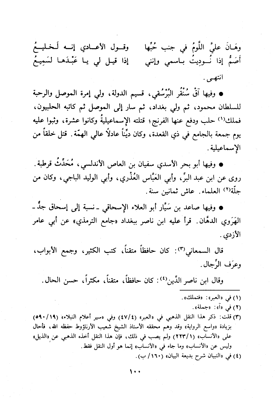 [3] قلت: ذكر هذا النقل الذهبي في «العبر» (4/ 47) وفي «سير أعلام النبلاء» (19/ 590) بزيادة «واسع الرواية» وقد وهم محققه الأستاذ الشيخ شعيب الأرناؤوط حفظه الله، فأحال على «الأنساب» (1/ 223) ولم يصب في ذلك، فإن هذا النقل أخذه الذهبي عن «الذيل» وليس عن «الأنساب» وما جاء في «الأنساب» إنما هو أول النقل فقط.