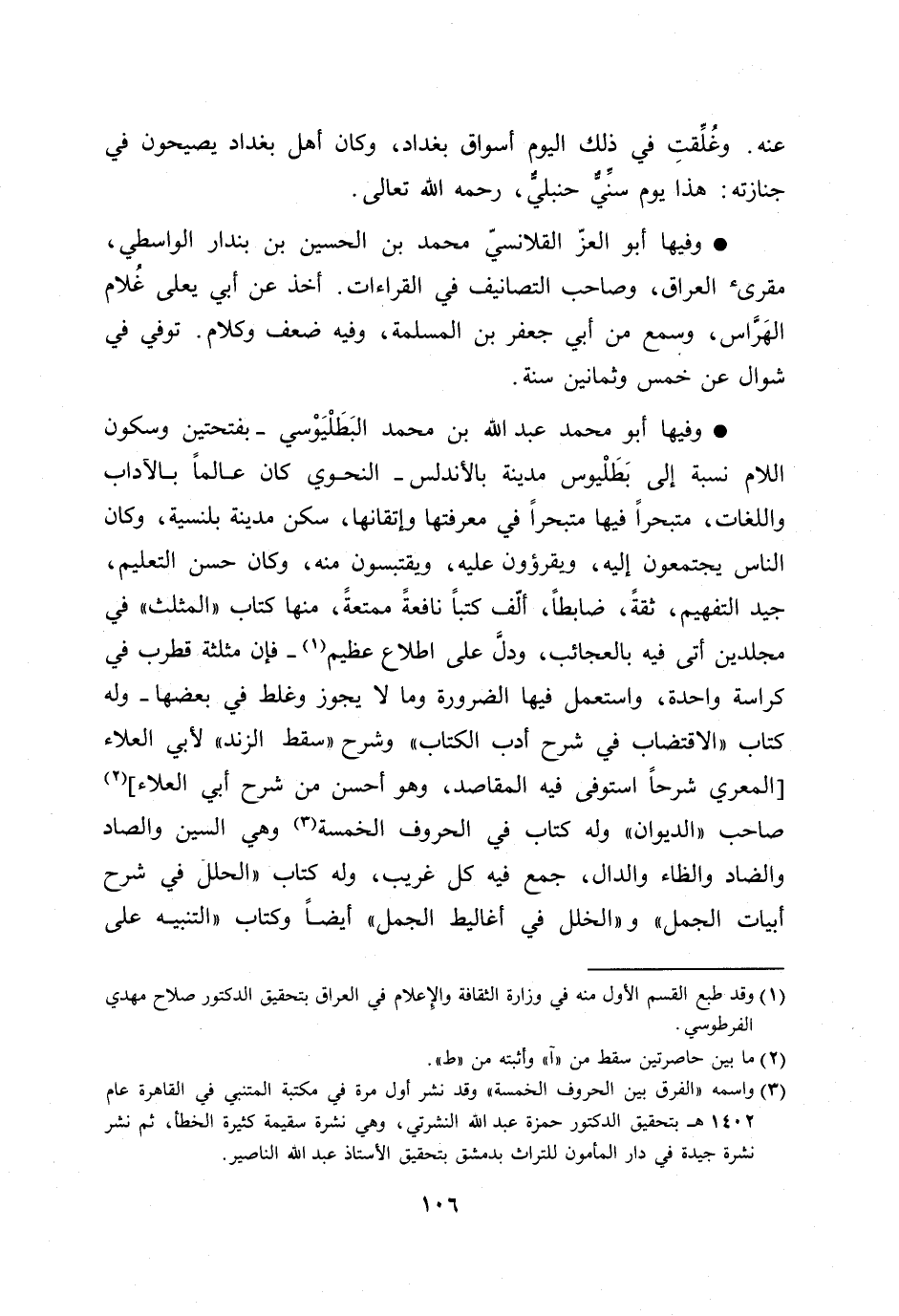 وفيها أبو محمد عبد الله بن محمد البطليوسي- بفتحتين وسكون اللام نسبة إلى بطليوس مدينة بالأندلس- النحوي كان عالما بالآداب واللغات، متبحرا فيها متبحرا في معرفتها وإتقانها، سكن مدينة بلنسية، وكان الناس يجتمعون إليه، ويقرؤون عليه، ويقتبسون منه، وكان حسن التعليم، جيد التفهيم، ثقة، ضابطا، ألّف كتبا نافعة ممتعة، منها كتاب «المثلث» في مجلدين أتى فيه بالعجائب، ودلّ على اطلاع عظيم [1]- فإن مثلثة قطرب في كراسة واحدة، واستعمل فيها الضرورة وما لا يجوز وغلط في بعضها- وله كتاب «الاقتضاب في شرح أدب الكتاب» وشرح «سقط الزند» لأبي العلاء [المعري شرحا استوفى فيه المقاصد، وهو أحسن من شرح أبي العلاء] [2] صاحب «الديوان» وله كتاب في الحروف الخمسة [3] وهي السين والصاد والضاد والظاء والدال، جمع فيه كل غريب، وله كتاب «الحلل في شرح أبيات الجمل» و «الخلل في أغاليط الجمل» أيضا وكتاب «التنبيه على