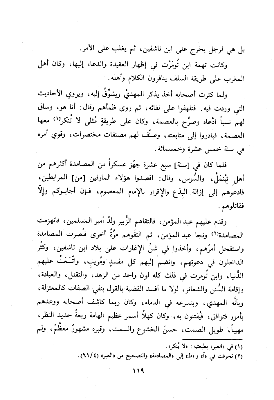 وقدم عليهم عبد المؤمن، فالتقاهم الزّبير ولد أمير المسلمين، فانهزمت المصامدة [2] ونجا عبد المؤمن، ثم التقوهم مرّة أخرى فنصرت الصامدة واستفحل أمرهم، وأخذوا في شنّ الإغارات على بلاد ابن تاشفين، وكثر الداخلون في دعوتهم، وانضم إليهم كل مفسد ومريب، واتّسعت عليهم الدّنيا، وابن تومرت في ذلك كله لون واحد من الزهد، والتقلل، والعبادة، وإقامة السّنن والشعائر، لولا ما أفسد القضية بالقول بنفي الصفات كالمعتزلة، وبأنّه المهدي، وبتسرعه في الدماء، وكان ربما كاشف أصحابه ووعدهم بأمور فتوافق، فيفتنون به، وكان كهلا أسمر عظيم الهامة ربعة حديد النظر، مهيبا، طويل الصمت، حسن الخشوع والسمت، وقبره مشهور معظّم، ولم