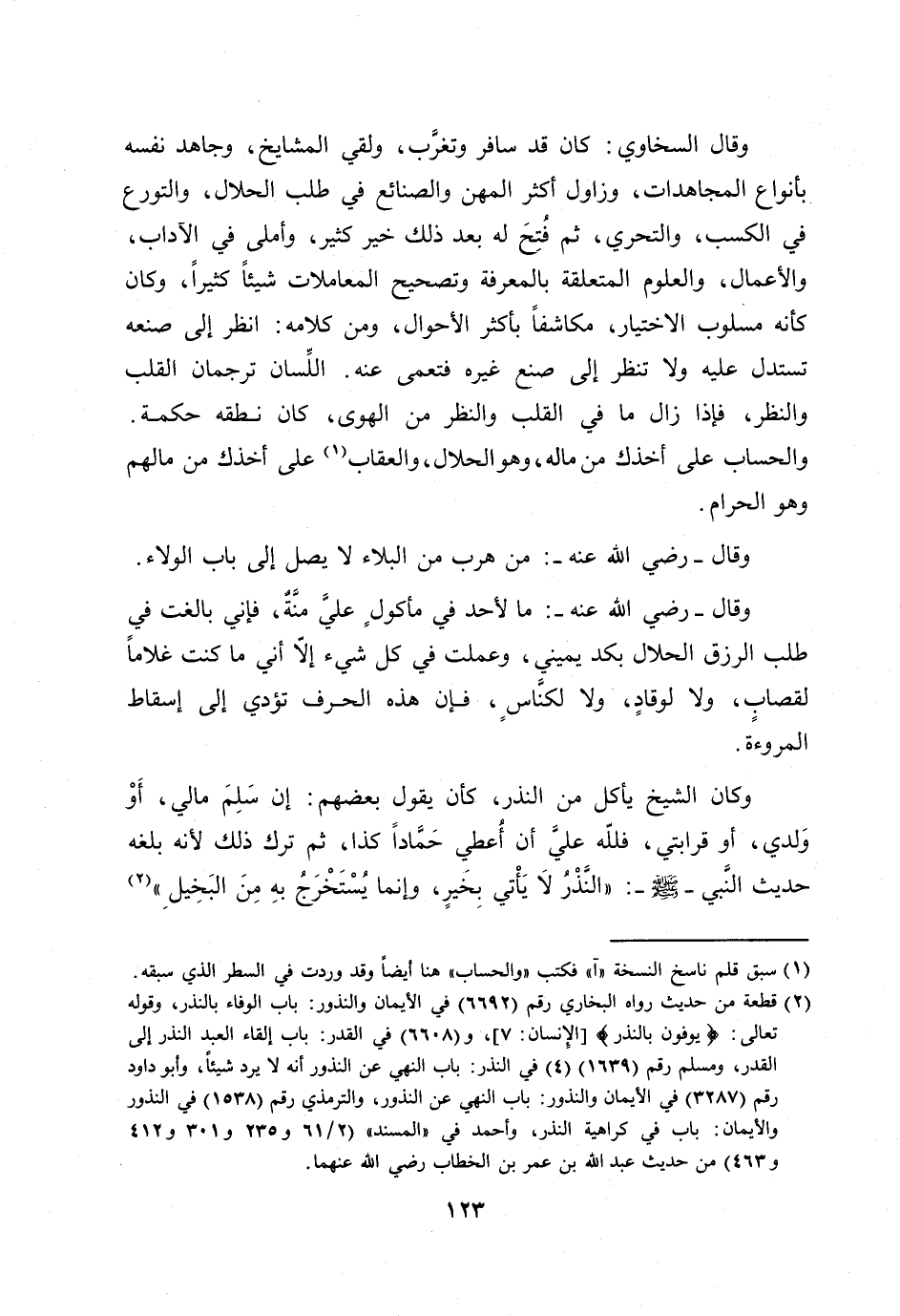 وكان الشيخ يأكل من النذر، كأن يقول بعضهم: إن سلم مالي، أو ولدي، أو قرابتي، فلله عليّ أن أعطي حمّادا كذا، ثم ترك ذلك لأنه بلغه حديث النّبي- صلّى الله عليه وسلم-: «النّذر لا يأتي بخير، وإنما يستخرج به من البخيل» [2]
