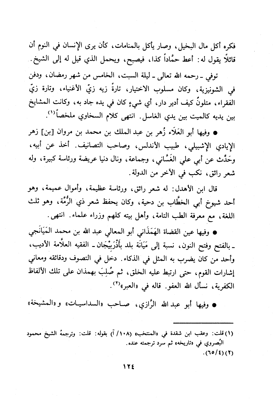 وفيها عين القضاة الهمذاني أبو المعالي عبد الله بن محمد الميانجي- بالفتح وفتح النون، نسبة إلى ميانة بلد بأذربيجان- الفقيه العلّامة الأديب، وأحد من كان يضرب به المثل في الذكاء. دخل في التصوف ودقائقه ومعاني إشارات القوم، حتى ارتبط عليه الخلق، ثم صلب بهمذان على تلك الألفاظ الكفرية، نسأل الله العفو. قاله في «العبر» [2] .