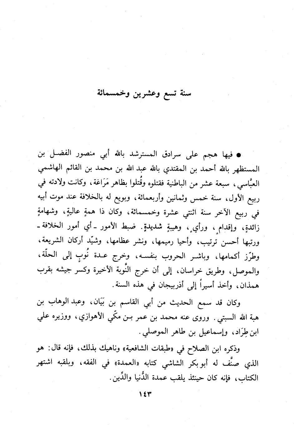 فيها هجم على سرادق المسترشد بالله أبي منصور الفضل بن المستظهر بالله أحمد بن المقتدي بالله عبد الله بن محمد بن القائم الهاشمي العبّاسي، سبعة عشر من الباطنية فقتلوه وقتلوا بظاهر مراغة، وكانت ولادته في ربيع الأول، سنة خمس وثمانين وأربعمائة، وبويع له بالخلافة عند موت أبيه في ربيع الآخر سنة اثنتي عشرة وخمسمائة، وكان ذا همة عالية، وشهامة زائدة، وإقدام، ورأي، وهيبة شديدة. ضبط الأمور- أي أمور الخلافة- ورتبها أحسن ترتيب، وأحيا رميمها، ونشر عظامها، وشيّد أركان الشريعة، وطرّز أكمامها، وباشر الحروب بنفسه، وخرج عدة نوب إلى الحلّة، والموصل، وطريق خراسان، إلى أن خرج النّوبة الأخيرة وكسر جيشه بقرب همذان، وأخذ أسيرا إلى أذربيجان في هذه السنة.