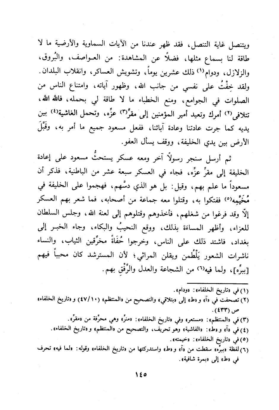ولقد خفت على نفسي من جانب الله، وظهور آياته، وامتناع الناس من الصلوات في الجوامع، ومنع الخطباء ما لا طاقة لي بحمله، فالله الله، تتلافى [2] أمرك وتعيد أمير المؤمنين إلى مقرّ [3] عزّة، وتحمل الغاشية [4] بين يديه كما جرت عادتنا وعادة آبائنا، ففعل مسعود جميع ما أمر به، وقبّل الأرض بين يدي الخليفة، ووقف يسأل العفو.