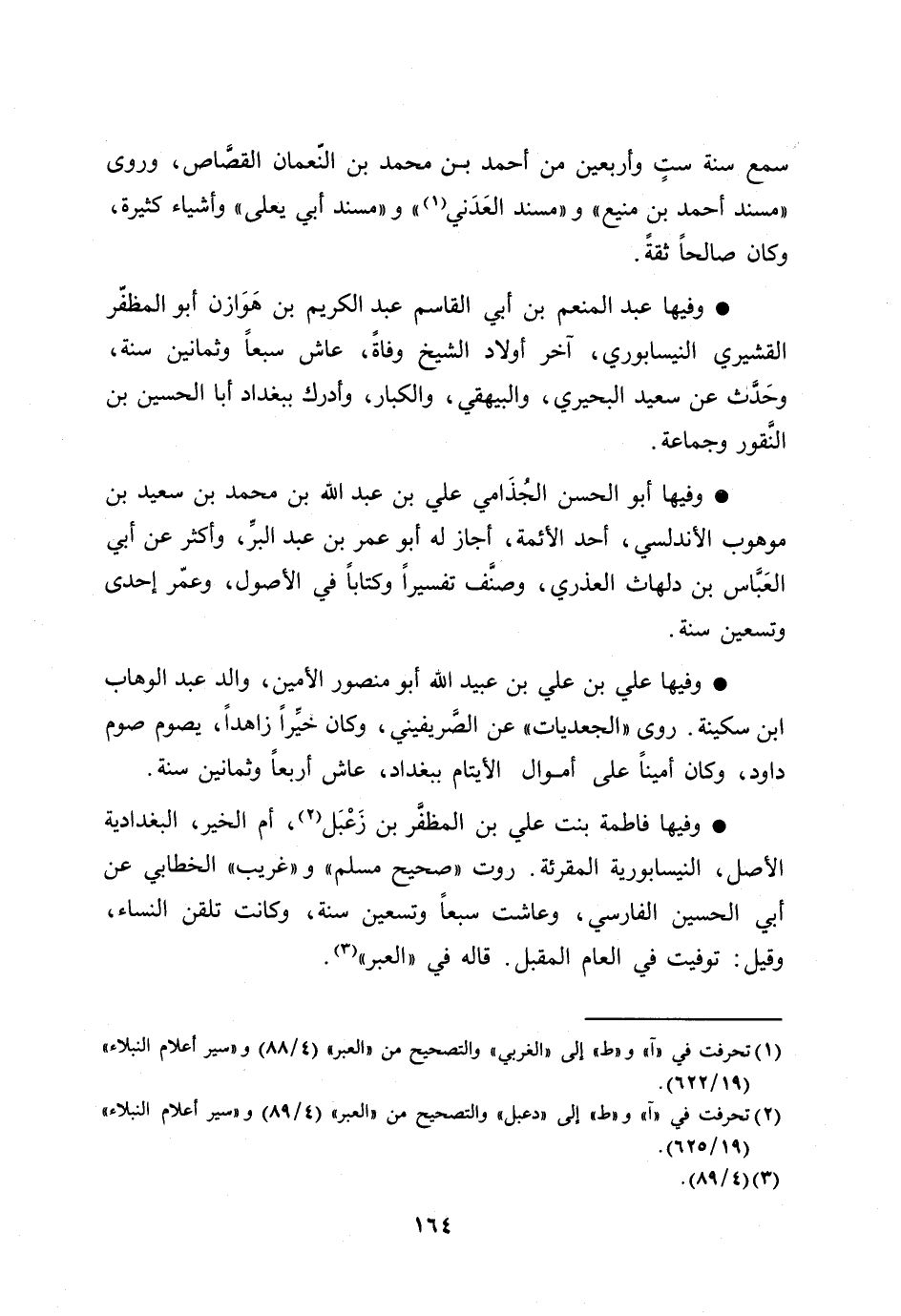 وفيها عبد المنعم بن أبي القاسم عبد الكريم بن هوازن أبو المظفّر القشيري النيسابوري، آخر أولاد الشيخ وفاة، عاش سبعا وثمانين سنة، وحدّث عن سعيد البحيري، والبيهقي، والكبار، وأدرك ببغداد أبا الحسين بن النّقور وجماعة.