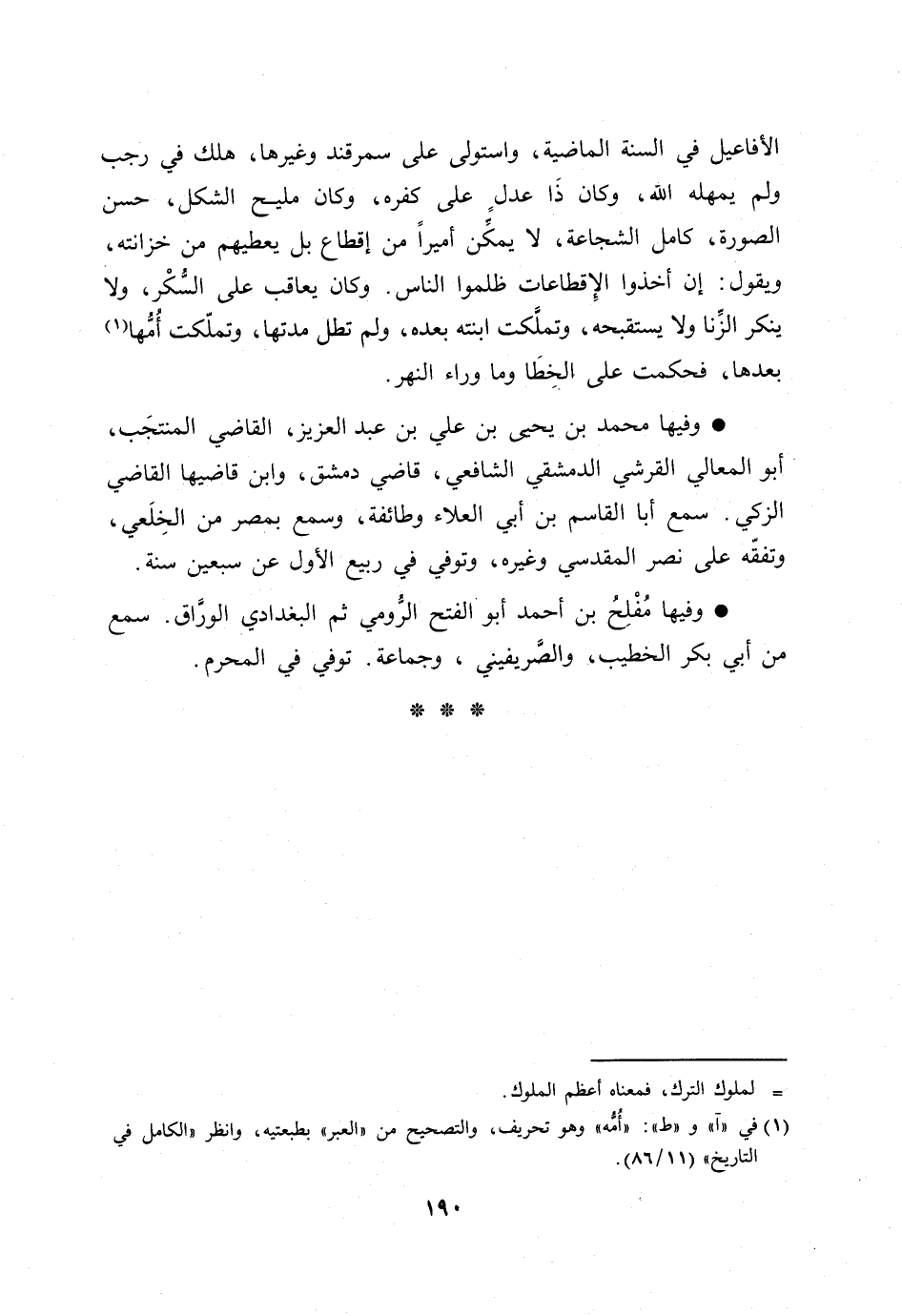 الأفاعيل في السنة الماضية، واستولى على سمرقند وغيرها، هلك في رجب ولم يمهله الله، وكان ذا عدل على كفره، وكان مليح الشكل، حسن الصورة، كامل الشجاعة، لا يمكّن أميرا من إقطاع بل يعطيهم من خزانته، ويقول: إن أخذوا الإقطاعات ظلموا الناس. وكان يعاقب على السّكر، ولا ينكر الزّنا ولا يستقبحه، وتملّكت ابنته بعده، ولم تطل مدتها، وتملّكت أمّها [1] بعدها، فحكمت على الخطا وما وراء النهر.