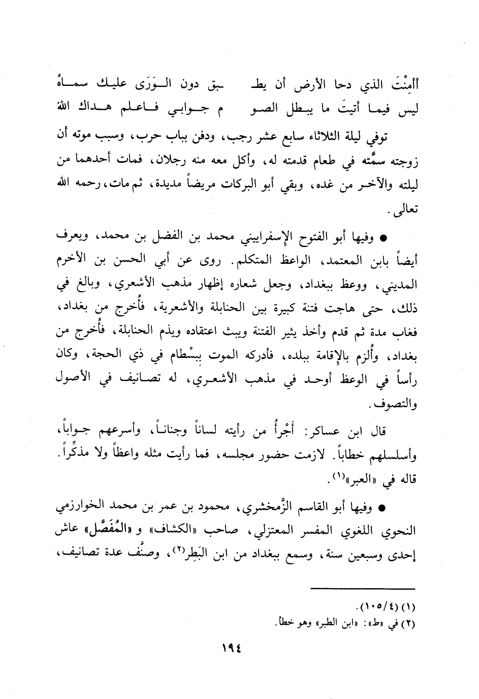 وفيها أبو القاسم الزّمخشري، محمود بن عمر بن محمد الخوارزمي النحوي اللغوي المفسر المعتزلي، صاحب «الكشاف» و «المفصّل» عاش إحدى وسبعين سنة، وسمع ببغداد من ابن البطر [2] ، وصنّف عدة تصانيف،