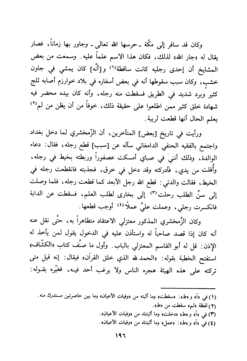 وكان قد سافر إلى مكّة- حرسها الله تعالى- وجاور بها زمانا، فصار يقال له «جار الله» لذلك، فكان هذا الاسم علما عليه. وسمعت من بعض المشايخ أن إحدى رجليه كانت ساقطة [1] و [أنّه] كان يمشي في جاون خشب، وكان سبب سقوطها أنه في بعض أسفاره في بلاد خوارزم أصابه ثلج كثير وبرد شديد في الطريق فسقطت منه رجله، وأنه كان بيده محضر فيه شهادة خلق كثير ممن اطلعوا على حقيقة ذلك، خوفا من أن يظن من لم [2] يعلم الحال أنها قطعت لريبة.