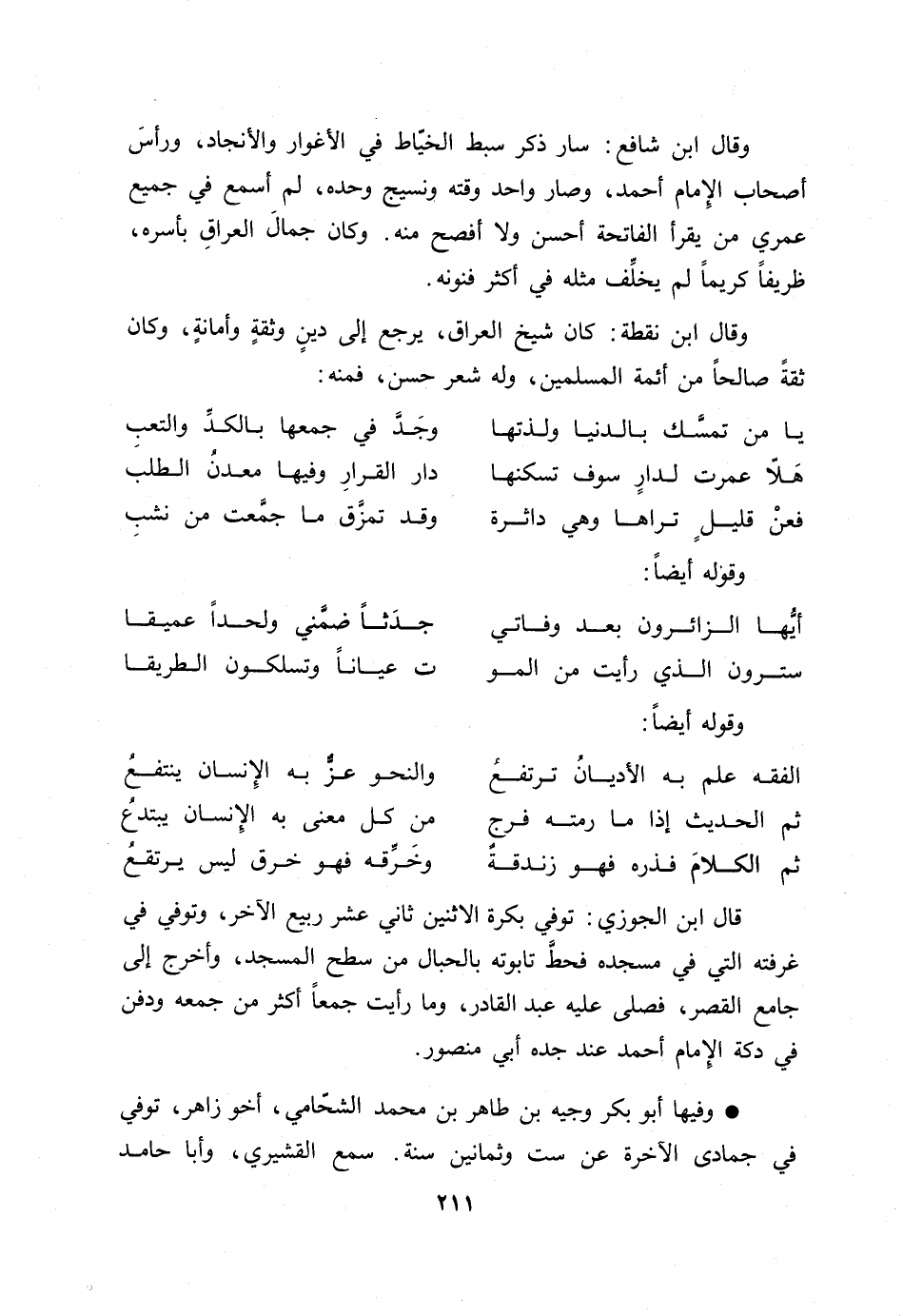 وقال ابن نقطة: كان شيخ العراق، يرجع إلى دين وثقة وأمانة، وكان ثقة صالحا من أئمة المسلمين، وله شعر حسن، فمنه: