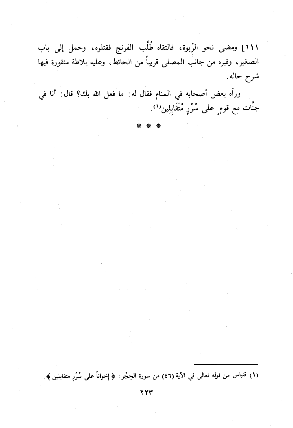 111] ومضى نحو الرّبوة، فالتقاه طلّب الفرنج فقتلوه، وحمل إلى باب الصغير، وقبره من جانب المصلى قريبا من الحائط، وعليه بلاطة منقورة فيها شرح حاله.