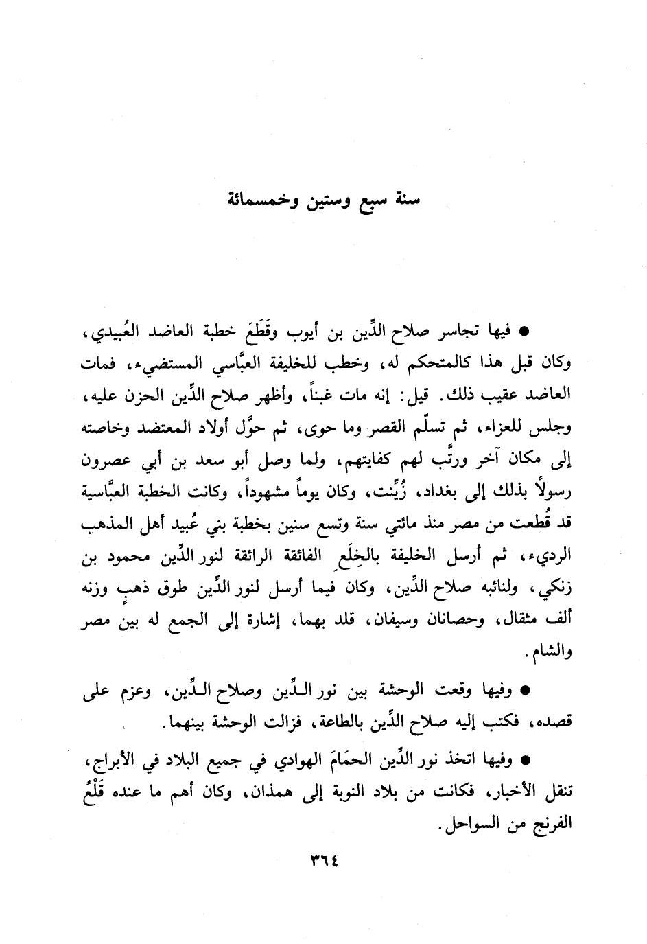 فيها تجاسر صلاح الدّين بن أيوب وقطع خطبة العاضد العبيدي، وكان قبل هذا كالمتحكم له، وخطب للخليفة العبّاسي المستضيء، فمات العاضد عقيب ذلك. قيل: إنه مات غبنا، وأظهر صلاح الدّين الحزن عليه، وجلس للعزاء، ثم تسلّم القصر وما حوى، ثم حوّل أولاد المعتضد وخاصته إلى مكان آخر ورتّب لهم كفايتهم، ولما وصل أبو سعد بن أبي عصرون رسولا بذلك إلى بغداد، زيّنت، وكان يوما مشهودا، وكانت الخطبة العبّاسية قد قطعت من مصر منذ مائتي سنة وتسع سنين بخطبة بني عبيد أهل المذهب الرديء، ثم أرسل الخليفة بالخلع الفائقة الرائقة لنور الدّين محمود بن زنكي، ولنائبه صلاح الدّين، وكان فيما أرسل لنور الدّين طوق ذهب وزنه ألف مثقال، وحصانان وسيفان، قلد بهما، إشارة إلى الجمع له بين مصر والشام.