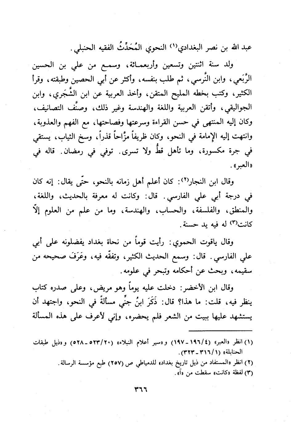 وقال ابن النجار [2] : كان أعلم أهل زمانه بالنحو، حتّى يقال: إنه كان في درجة أبي علي الفارسي. قال: وكانت له معرفة بالحديث، واللغة، والمنطق، والفلسفة، والحساب، والهندسة، وما من علم من العلوم إلّا كانت [3] له فيه يد حسنة.