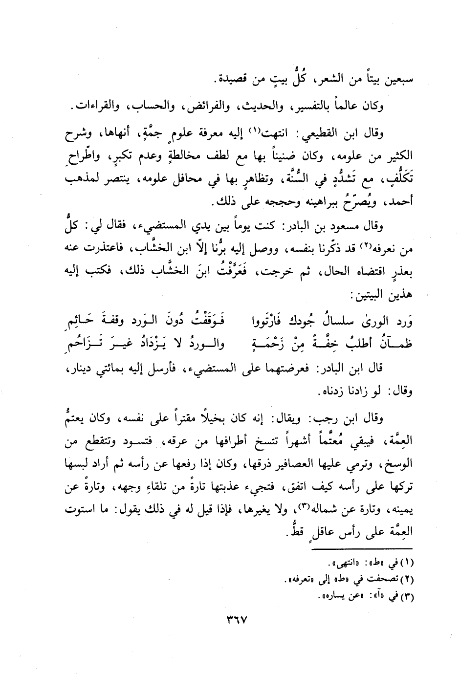 وقال ابن القطيعي: انتهت [1] إليه معرفة علوم جمّة، أنهاها، وشرح الكثير من علومه، وكان ضنينا بها مع لطف مخالطة وعدم تكبر، واطّراح تكلّف، مع تشدّد في السّنّة، وتظاهر بها في محافل علومه، ينتصر لمذهب أحمد، ويصرّح ببراهينه وحججه على ذلك.