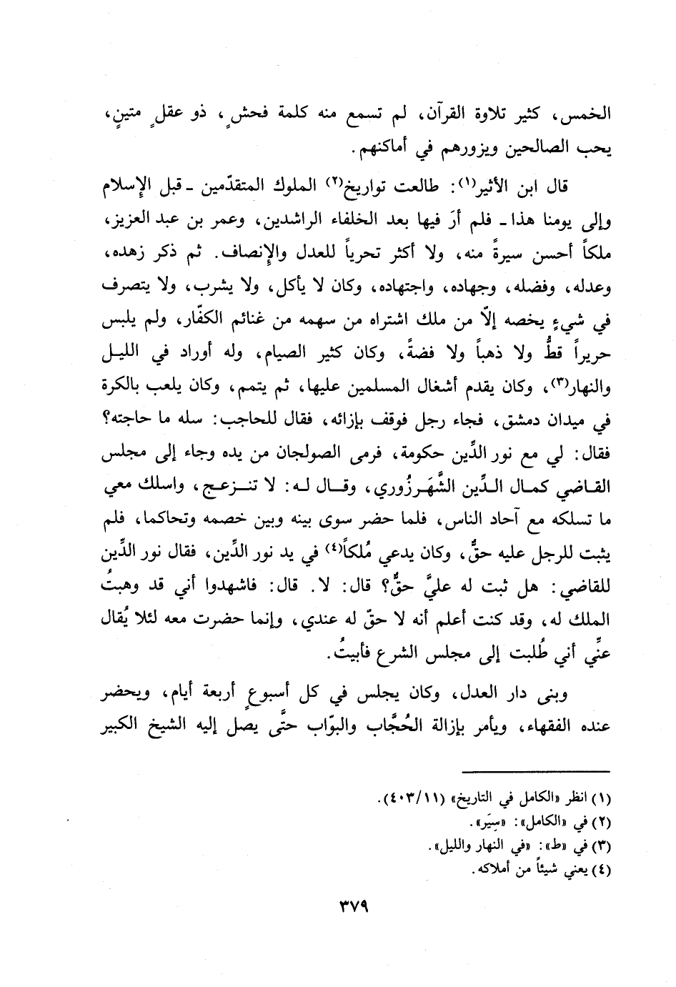 فقال: لي مع نور الدّين حكومة، فرمى الصولجان من يده وجاء إلى مجلس القاضي كمال الدّين الشّهرزوري، وقال له: لا تنزعج، واسلك معي ما تسلكه مع آحاد الناس، فلما حضر سوى بينه وبين خصمه وتحاكما، فلم يثبت للرجل عليه حقّ، وكان يدعي ملكا [4] في يد نور الدّين، فقال نور الدّين للقاضي: هل ثبت له عليّ حقّ؟ قال: لا. قال: فاشهدوا أني قد وهبت الملك له، وقد كنت أعلم أنه لا حقّ له عندي، وإنما حضرت معه لئلا يقال عنّي أني طلبت إلى مجلس الشرع فأبيت.